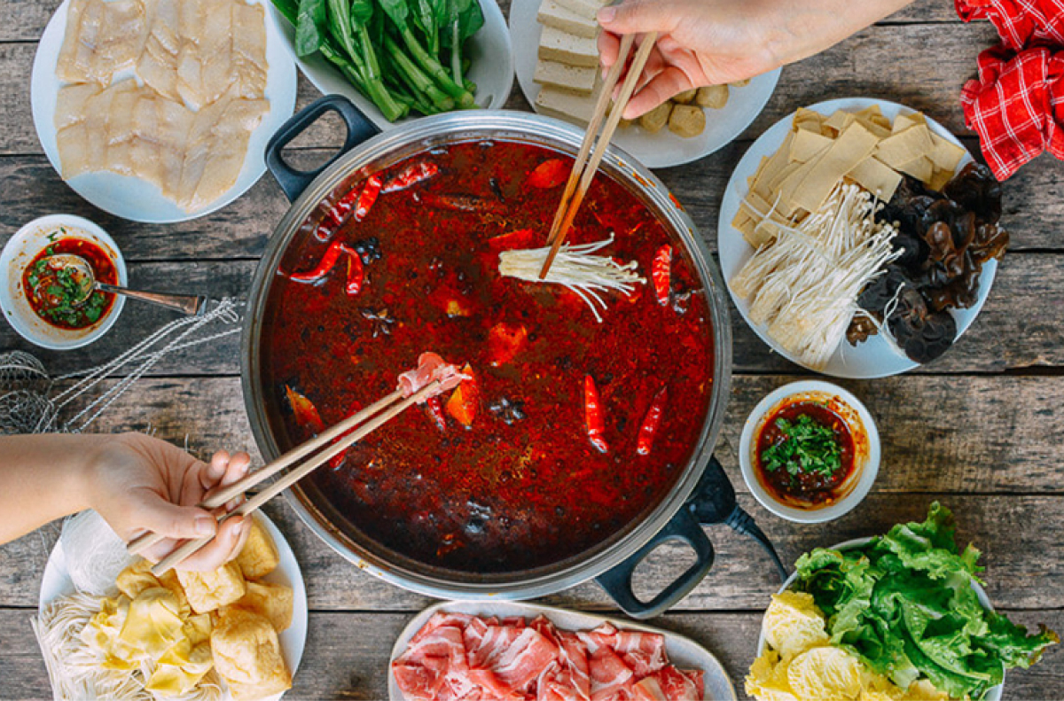 Lẩu cay Hồ Nam, với nước dùng đỏ rực và nguyên liệu tươi như thịt bò, rau rừng, là trải nghiệm ấm áp giữa khí hậu se lạnh của Trương Gia Giới.