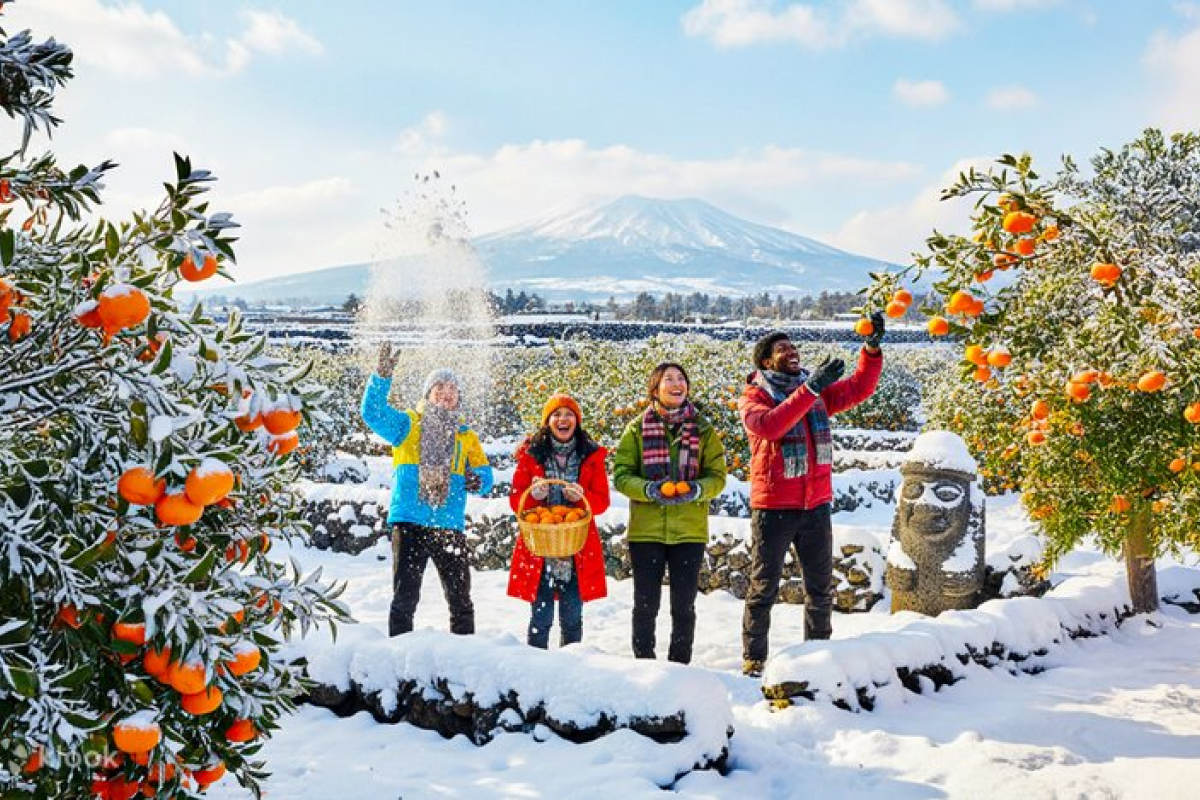 Một trong những trải nghiệm đặc trưng mùa đông ở Jeju là hái quýt tươi trực tiếp từ vườn. Khi những quả quýt chín mọng, du khách có thể tự tay hái, thưởng thức và chụp ảnh giữa khung cảnh vườn cây xanh mướt điểm những quả vàng rực rỡ giữa tiết trời se lạnh.