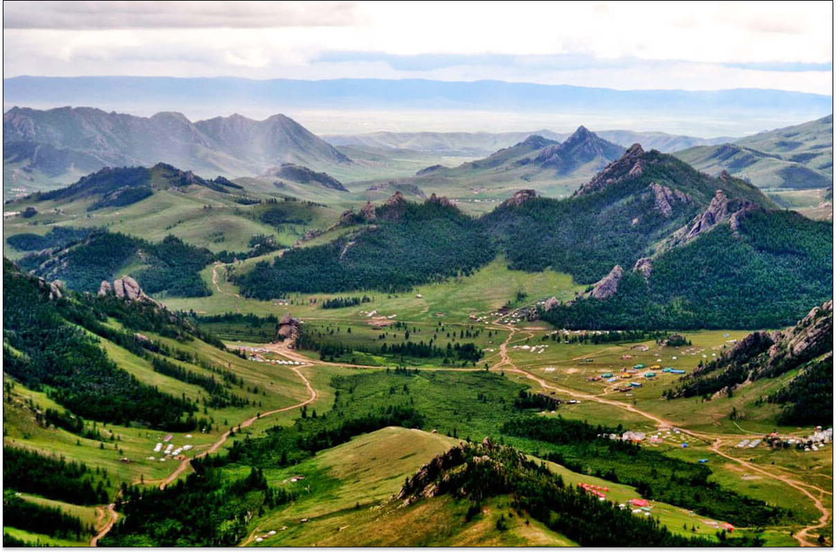 Chỉ cách Ulaanbaatar khoảng 70 km, Terelj là công viên quốc gia nổi tiếng nhất Mông Cổ. Nơi đây có cảnh quan núi non, thảo nguyên, cùng những khối đá kỳ lạ như Turtle Rock (Đá Rùa). Du khách có thể cưỡi ngựa, leo núi hoặc nghỉ tại các ger camp để trải nghiệm đời sống du mục. Ngoài ra, Terelj còn có Tu viện Aryabal, một điểm đến yên tĩnh với tầm nhìn đẹp ra thung lũng.