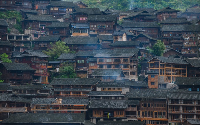 Đến đây bạn sẽ bắt gặp một mái ngói cổ kính của những căn nhà trong Tây Giang Miêu trại đều là loại ngói âm dương màu xám đen, xếp chồng lên nhau. Miêu trại có thời tiết gần giống Sapa của Việt Nam, một màu mát mẻ vào mùa hè và có thể xuất hiện tuyết rơi vào mùa đông.