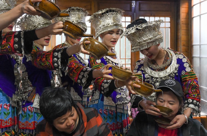 Người Miêu có cách mời khách uống rượu rất đặc trưng. Du khách chỉ cần ngồi tại bàn, các cô gái Miêu sẽ tới hát và mời uống. Rượu được rót dần từ trên xuống đến khi nào khách không uống được nữa mới thôi. Đây là nét văn hoá lâu đời của người Miêu tại đây. Khách du lịch có thể trải nghiệm nếu đặt sớm với các chủ nhà hàng để họ chuẩn bị.
