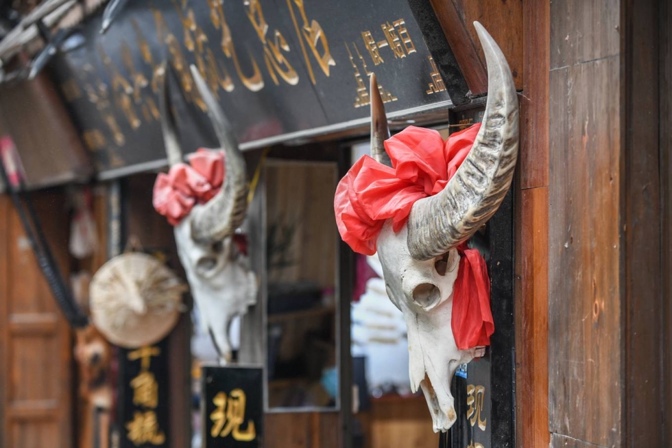 Những cửa hàng mua sắm thường treo xương đầu trâu, dê và một số loài động vật còn nguyên sừng trước cửa. Những loài có sừng được người Miêu coi là con vật thần thánh để hiến tế trong các nghi lễ hoặc tạo nên các vật dụng thường ngày.