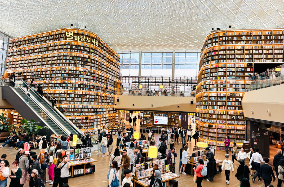 - Quý khách tiếp tục thăm quan và chụp hình tại Thư viện sách khổng lồ Starfield. Toàn bộ thư viện được nằm giữa khu vực trung tâm của COEX Mall, với phần trần cùng hai mặt bên bằng kính đem tới nguồn sáng tự nhiên cả ngày. Chính nhờ kiến trúc đặc biệt này mà ngoài chuyện là một thư viện, Starfield còn là một địa điểm sống ảo cực chuẩn vì đứng vào góc nào cũng ngập tràn nắng, tha hồ mà chụp ảnh.
